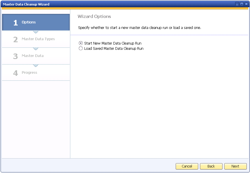 In the Wizard Options window, select Start New Master Data Cleanup Run.