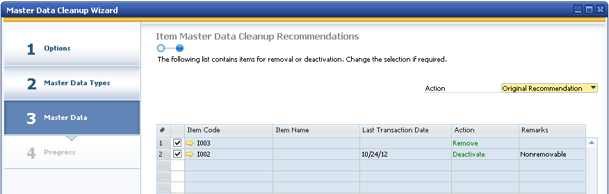 SAP Business One will analyze selected data and suggest actions (remove, deactivate, or retain).